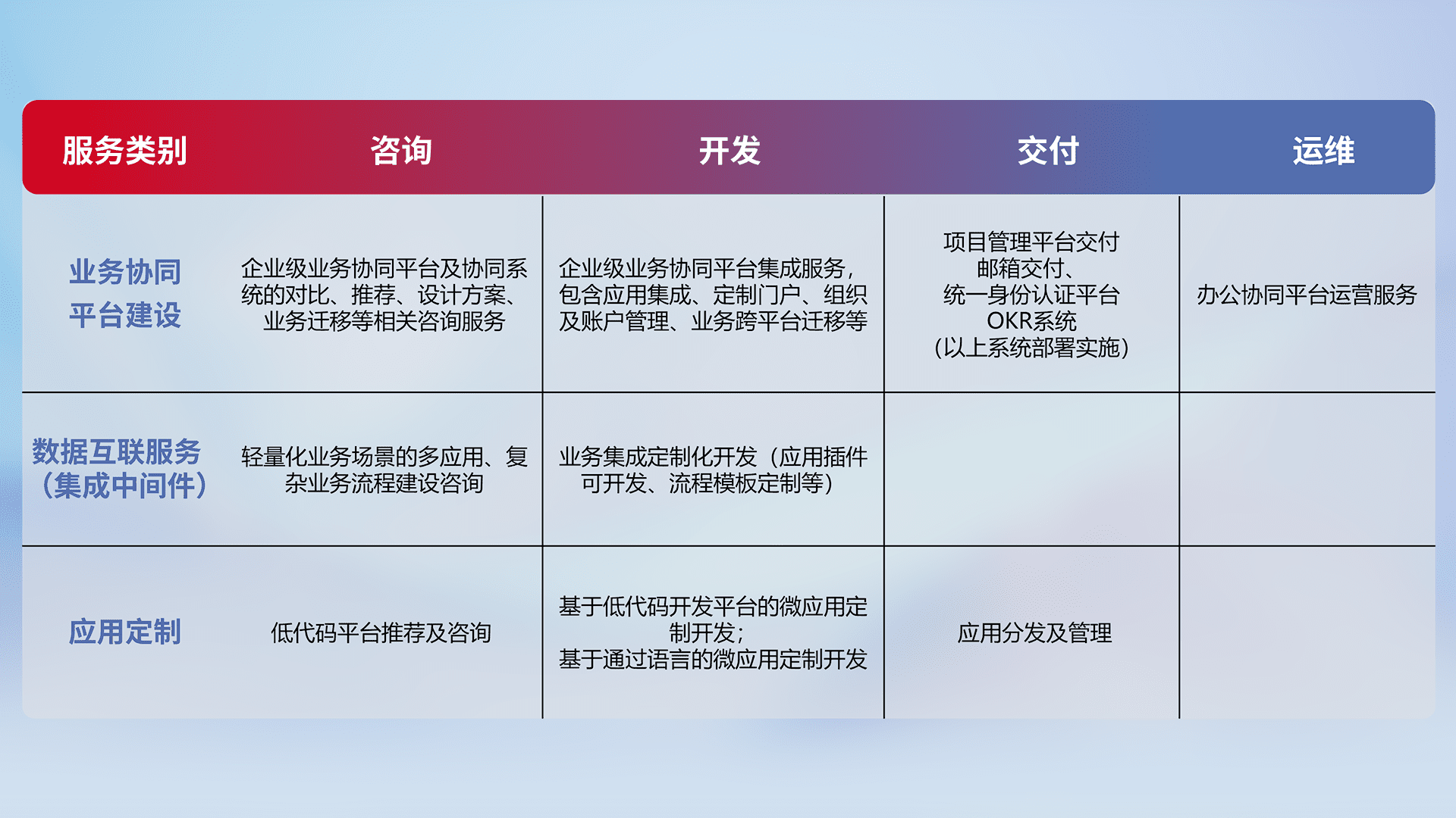 针对钉钉、、企微、、IDaas等平台级产品提供产品的规划、、、方案、、、、交付、、、、定制化开发等服务,,实现如统一协同办公、、、智能客户服务、、、混合会议管理、、、、智能数据查询、、、、等业务场景,,,,实现数字化转型。。