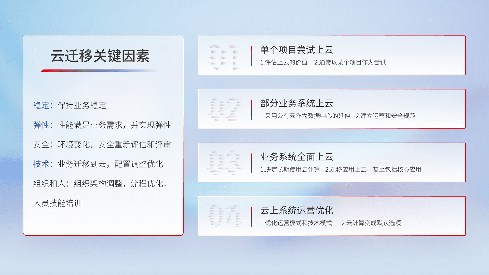 结合实际业务,,,从规划设计、、云平台选型、、、、云原生改造、、、数据迁移、、集成交付,,迁移全过程为客户识别最佳上云路径,,,,做好风险识别管理,,,设计网络架构、、、、身份权限、、、安全审计合规、、、操作审计、、、、日志审计、、、监控告警策略、、、、多站点容灾设计等,,,,对云上基础设施进行整体规划,,,提升IT治理水平,,以满足弹性、、、、高可用、、高性能的需求。。