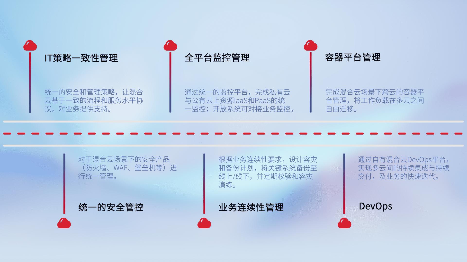 通过多云纳管,,,,以统一的资源数据模型把客户的云资源进行抽象和封装,,,进而实现对多云资源的统一操作,,保障云资源管理的可靠性、、稳定性与可用性。。。量身定制化运维内容,,配置、、开发运维、、补丁管理、、、、备份、、、监控、、认证和访问管理、、、审计和日常巡检等,,,保障在用云过程中的可靠度,,,,稳定度以及高可用率。。