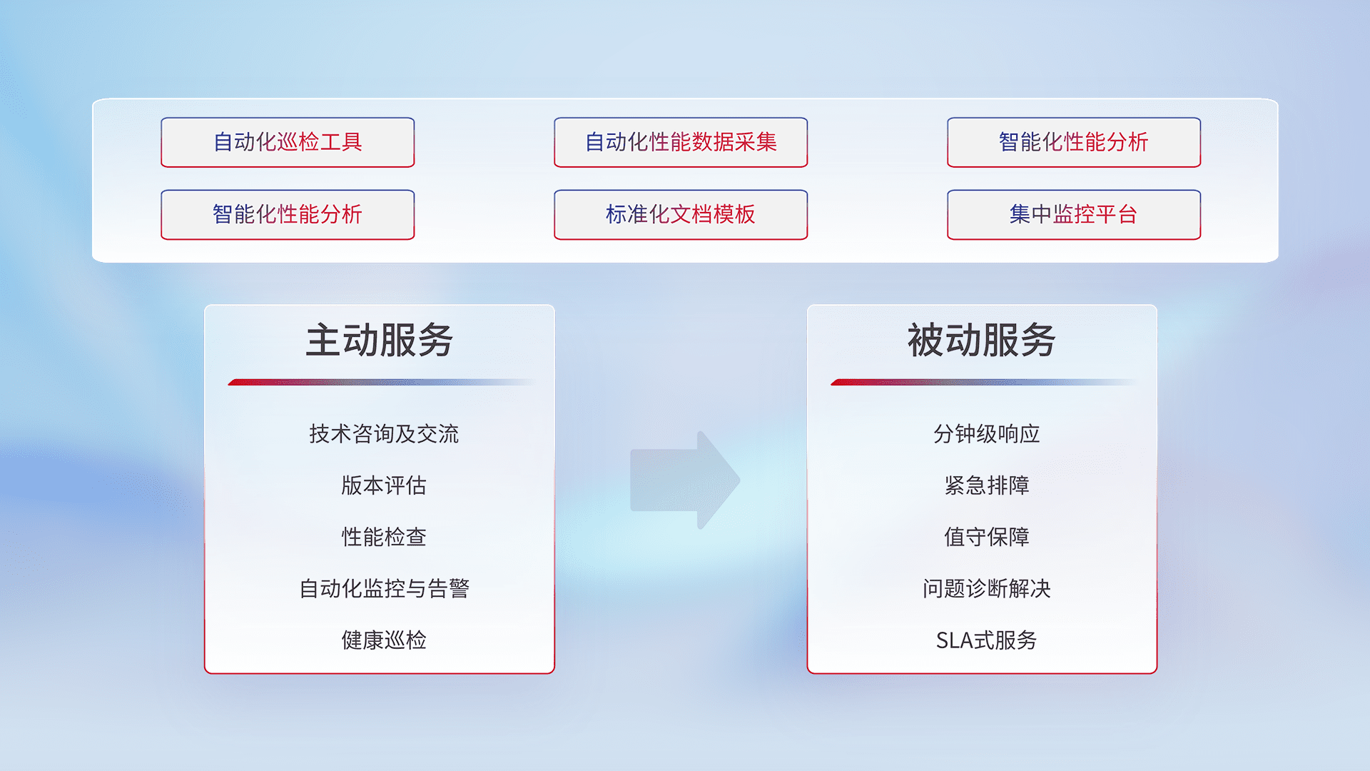智能化工具和标准化文档,,,保障服务质量,,,,提供主动服务(包含技术咨询、、、版本评估、、、性能检查、、自动化监控与告警、、健康巡检)和被动服务包含(分钟级响应、、、紧急排障、、、值守保障、、问题诊断解决、、、SLA服务)。。